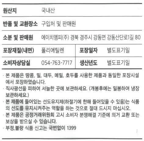 | 제조연월일, 소비기한 또는 품질유지기한 | 제조년월일 : 2025년 12월 26일 이후인 제조상품 | 세부 품목군별 표시사항 | 농수산물 : 유전자변형(해당 없음) / 지리적 표시사항(해당 없음) |