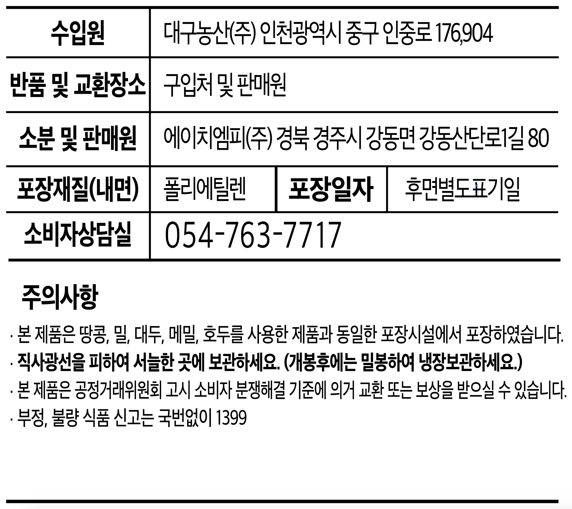 | 제조연월일, 소비기한 또는 품질유지기한 | 제조년월일 : 2026년 03월 06일 이후인 제조상품 | 세부 품목군별 표시사항 | 농수산물 : -유전자변형 : 해당없음 - 지리적 표시사항 : 해당없음 |