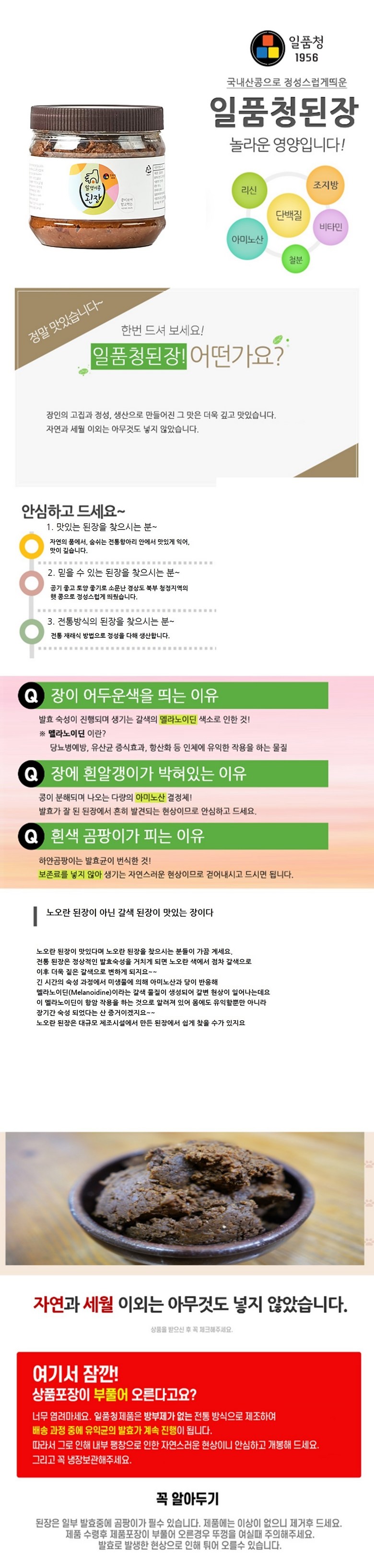 | 포장단위별 내용물의 용량(중량), 수량 | 500g, 900g, 2kg | 원재료명 및 함량 | 메주83%(국산), 정제염수17%(국산), 알레르기유발물질 대두함유 |