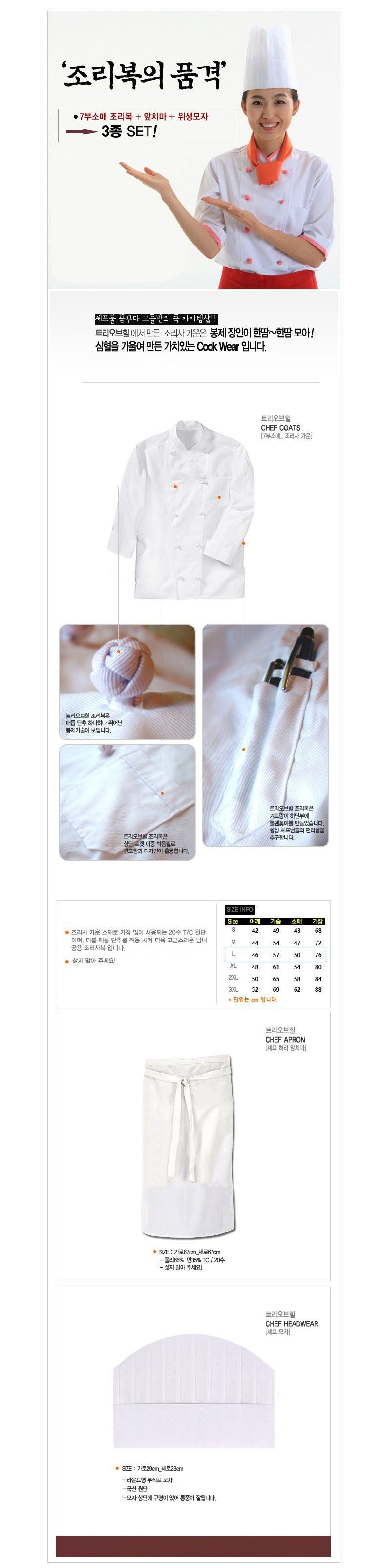 | 구성품 | 트리오브힐 7부 조리복 + 앞치마 + 위생모자 | 크기 | 컨텐츠참조 |
