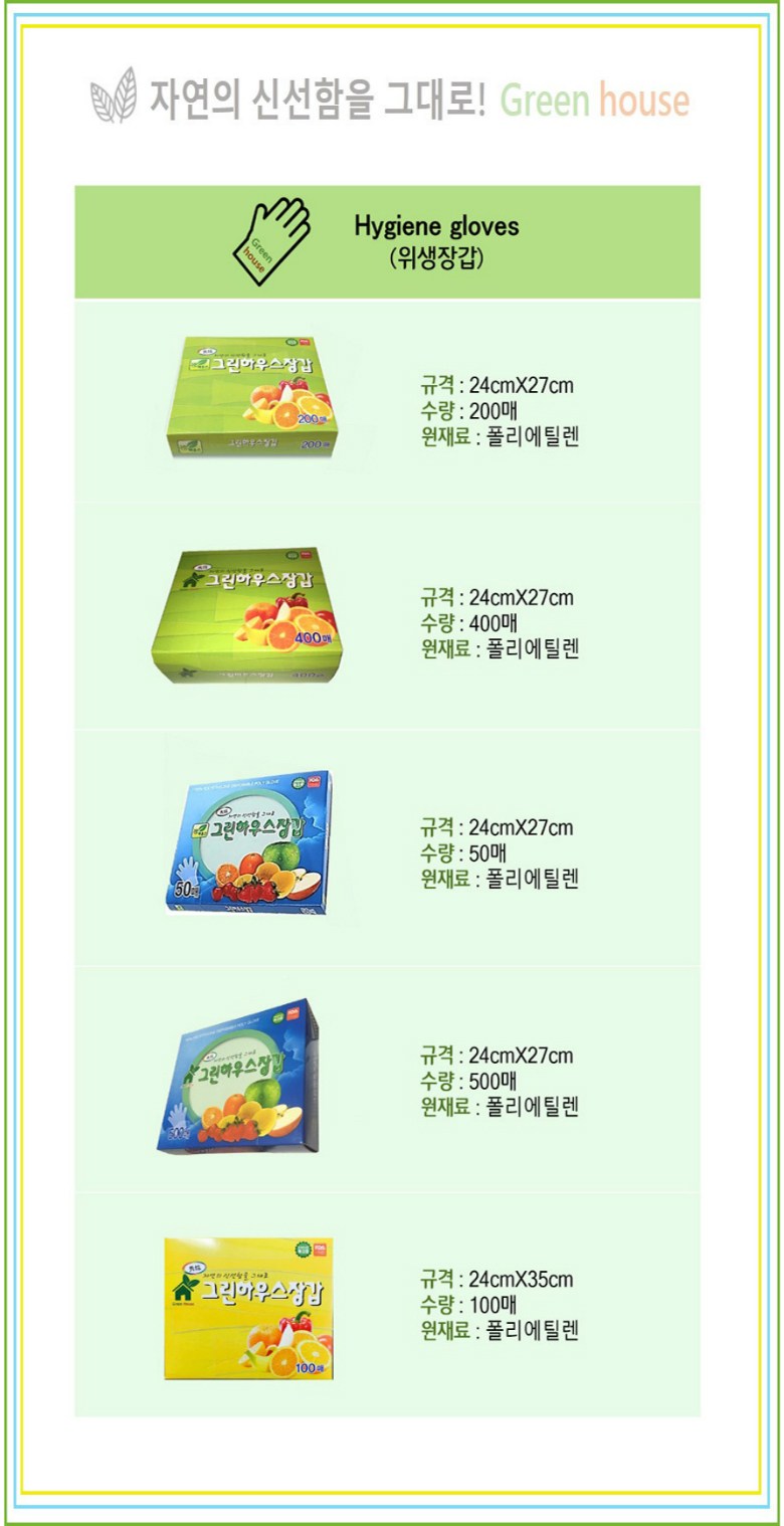 | 품명 및 모델명 | 그린하우스 위생장갑 500매, 4개 | 재질 | HDPE |
