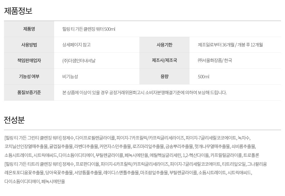 | 용량(중량) | 500ml | 제품 주요 사양 | 모든피부용 |