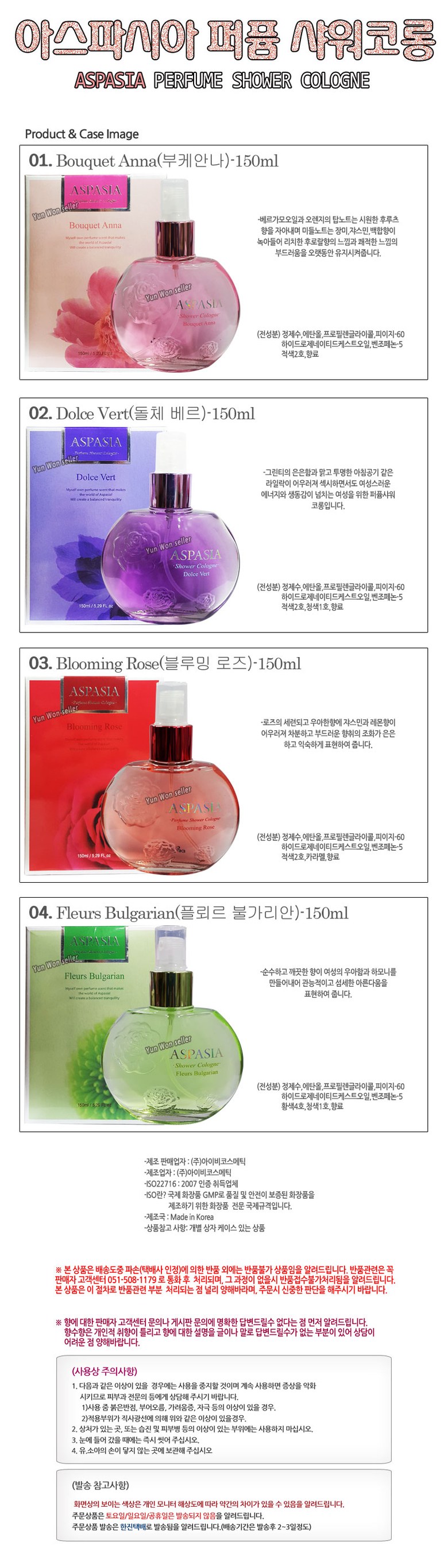 | 품명 및 모델명 | 아스파시아 퍼퓸 샤워코롱-150ml | 인증/허가 사항 | 해당사항없음 |