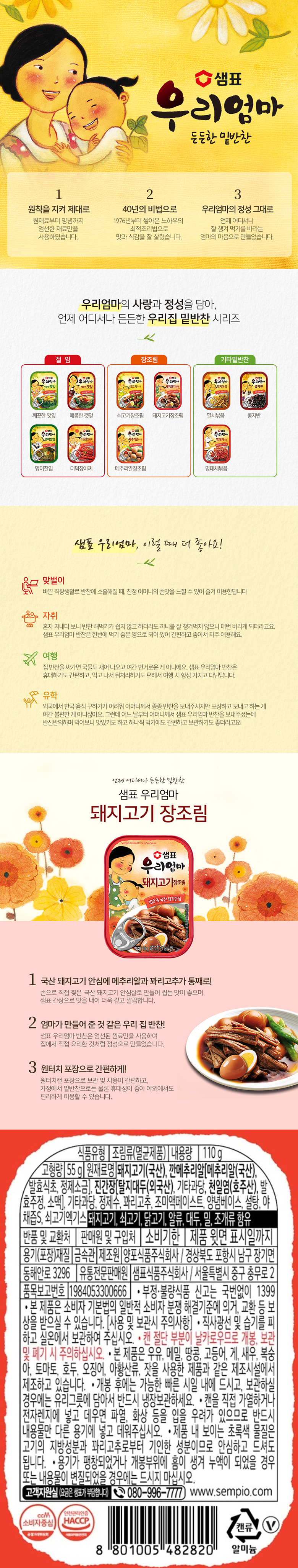 | 제품명 | 샘표 우리엄마 돼지고기장조림 | 식품의 유형 | 컨텐츠참조 |