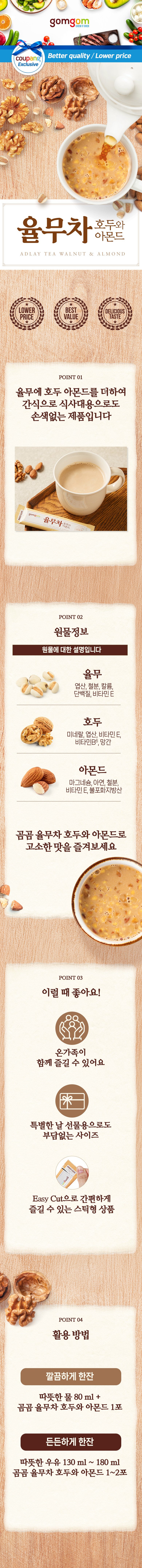 | 제품명 | 곰곰 율무차 호두와 아몬드 | 식품의 유형 | 고형차 |