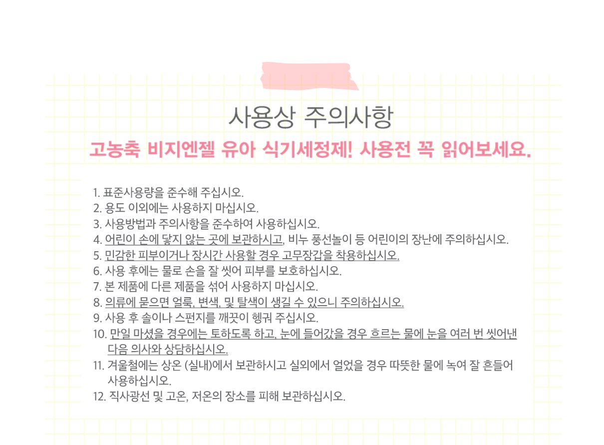 | 품명 및 모델명 | 비지엔젤 유아식기세정제 스윗애플 | 인증/허가 사항 | 해당없음 |