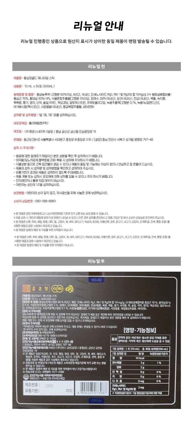 | 소비기한 및 보관방법 | 소비기한(또는 유통기한) : 2026년 08월 20일 이거나 그 이후인 상품 제조년월일 : 2024년 08월 21일 이후인 제조상품 보관방법: 컨텐츠 참조 | 포장단위별 내용물의 용량(중량), 수량 | 300ml(10mlX10포X3개), 1개 |