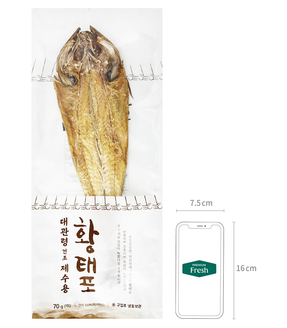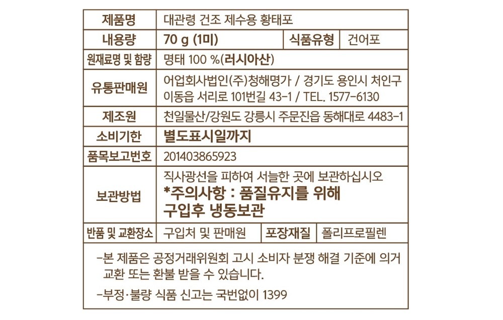 | 품목 또는 명칭 | 대관령 건조 제수용 황태포 | 포장단위별 내용물의 용량(중량),수량,크기 | 70g x 3봉,1개 |