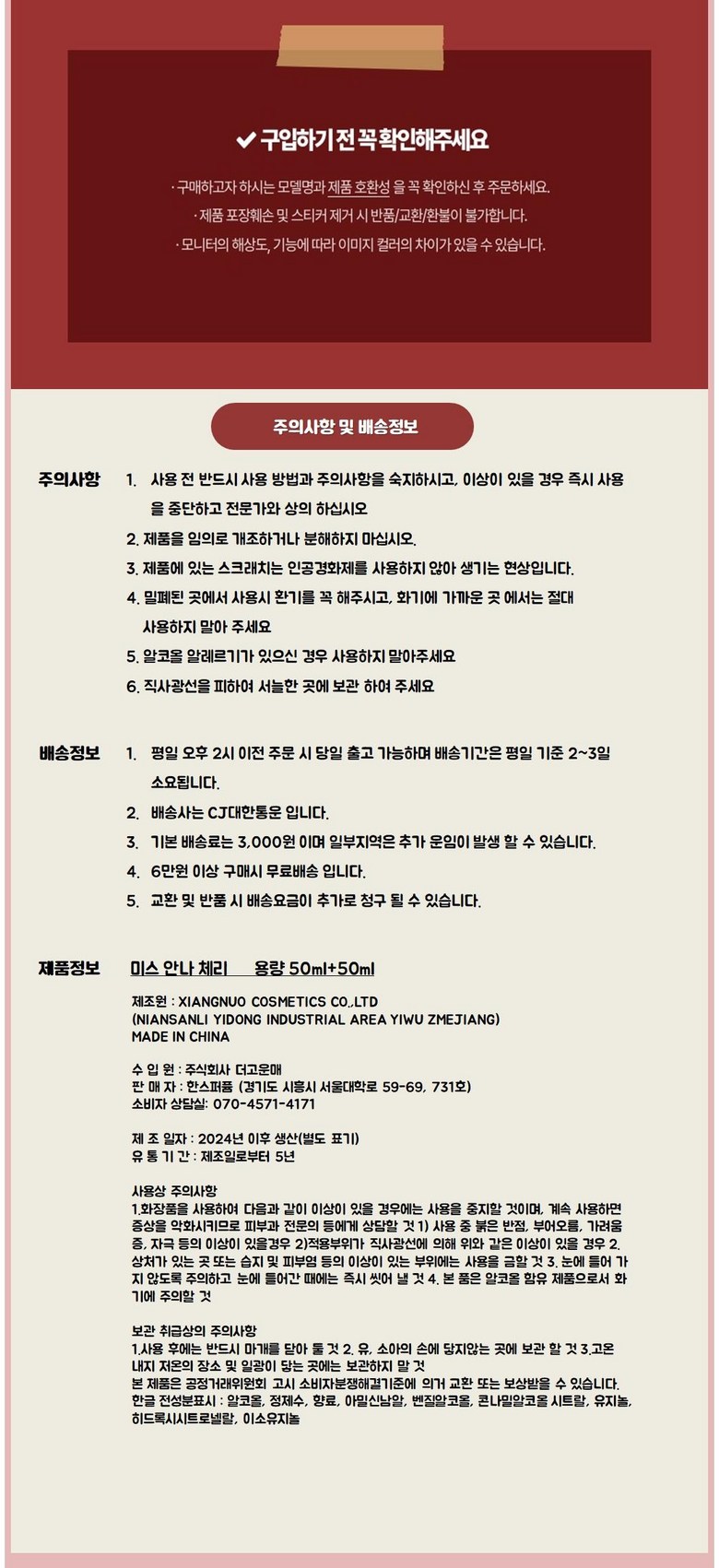 - ㆍ모니터 해상도의 차이로 인해 색상이나 이미지가 실제와 달라, 고객이 단순 변심으로 교환/반품을 무료로 요청하는 경우
