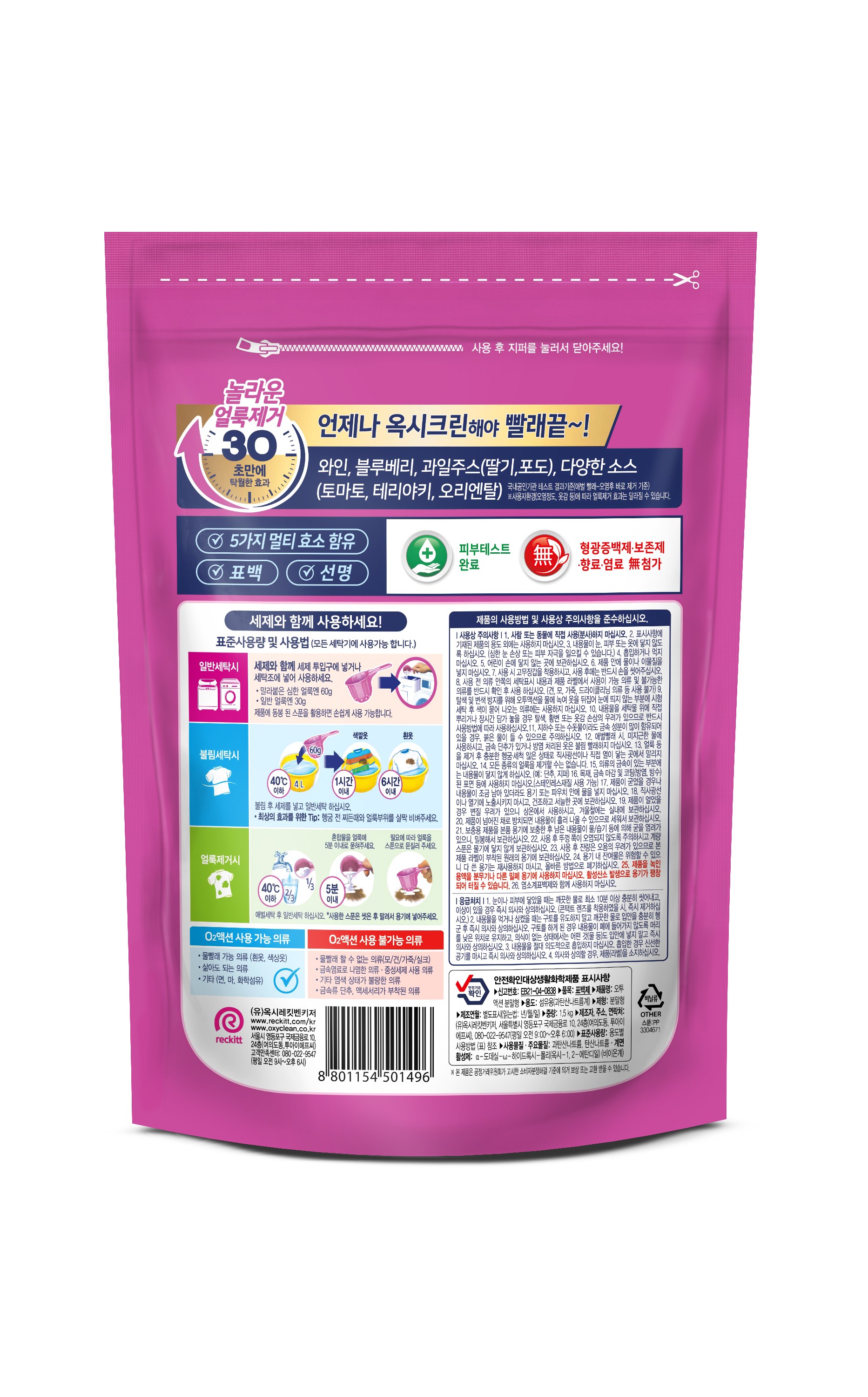 | 품목 및 제품명 | 표백제 / 오투액션 분말형 | 용도(표백제의 경우 계열을 함께표시) 및 제형 | 섬유용(과탄산나트륨계) / 분말형 |