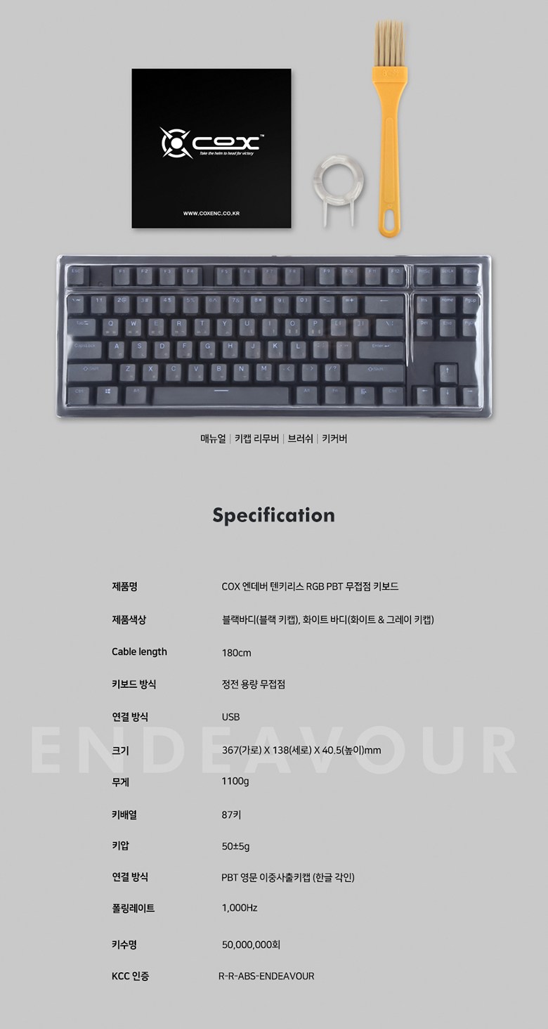 | 품명 및 모델명 | COX 콕스 엔데버 텐키리스 RGB PBT 방수 무접점 키보드 50g | KC 인증정보 | R-R-ABS-ENDEAVOUR |