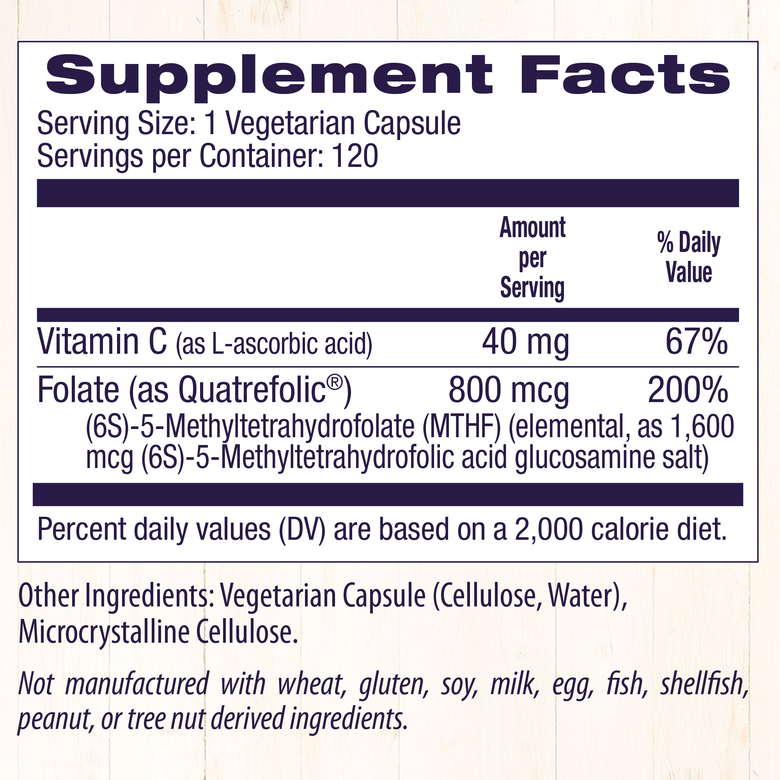 높은 생체이용률을 가졌으며 용해성의 형태를 지닌 엽산 보충제입니다. 1회 제공량 당 800mcg의 엽산과 40mg의 비타민 C를 제공합니다. 섭취 및 흡수가 용이한 베지 캡슐 형태로 제공됩니다.