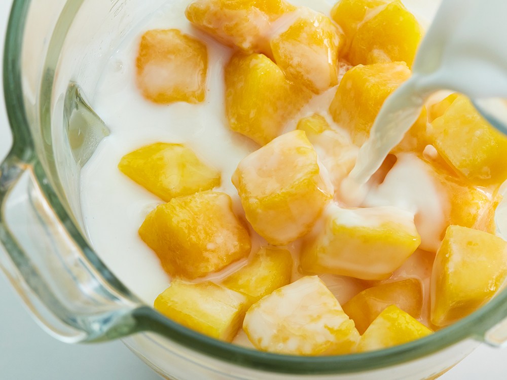 4. 냉동상태의 애플망고, 마시는 요거트, 꿀, 우유를 넣고 믹서에 갈아 애플망고 요거트 스무디를 만들어보세요.