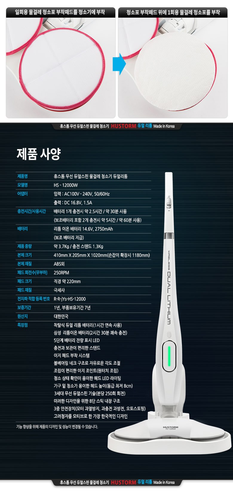| 품명 및 모델명 | 휴스톰 듀얼리튬 물걸레청소기 HS-12000W | KC 인증정보 | 본품: XH100141-16003C, R-R-jYs-HS-12000 / 어댑터: HD10033-18017B, R-REM-APW-APS-1814 |