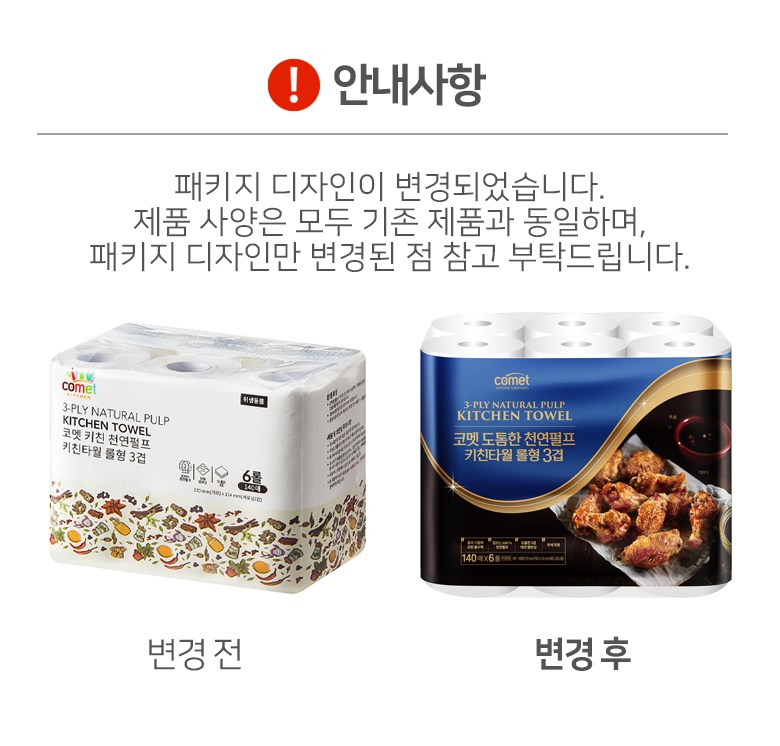 | 품명 및 모델명 | 코멧 키친 천연펄프 키친타올 롤형 140매 3겹 | 인증/허가 사항 | 위생용품 |