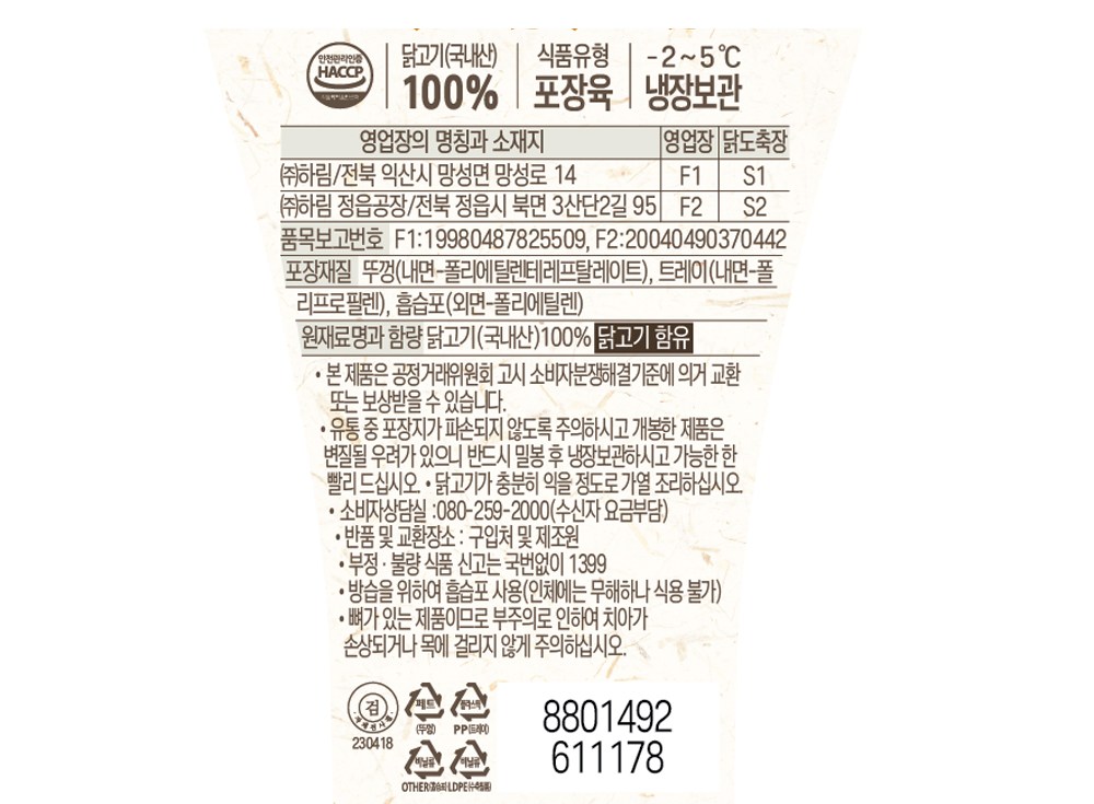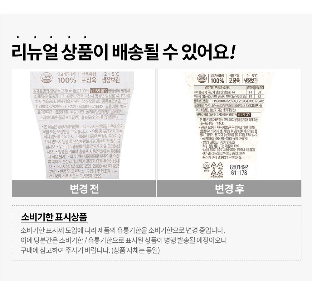 | 제조연월일, 소비기한 또는 품질유지기한 | 소비기한(또는 유통기한) : 2026년 02월 14일 이거나 그 이후인 상품 제조년월일 : 2026년 02월 06일 이후인 제조상품 | 세부 품목군별 표시사항 | 축산물 등급표시 : 해당 없음 / 이력번호 표시유무 : 이력번호 표시제품임 |