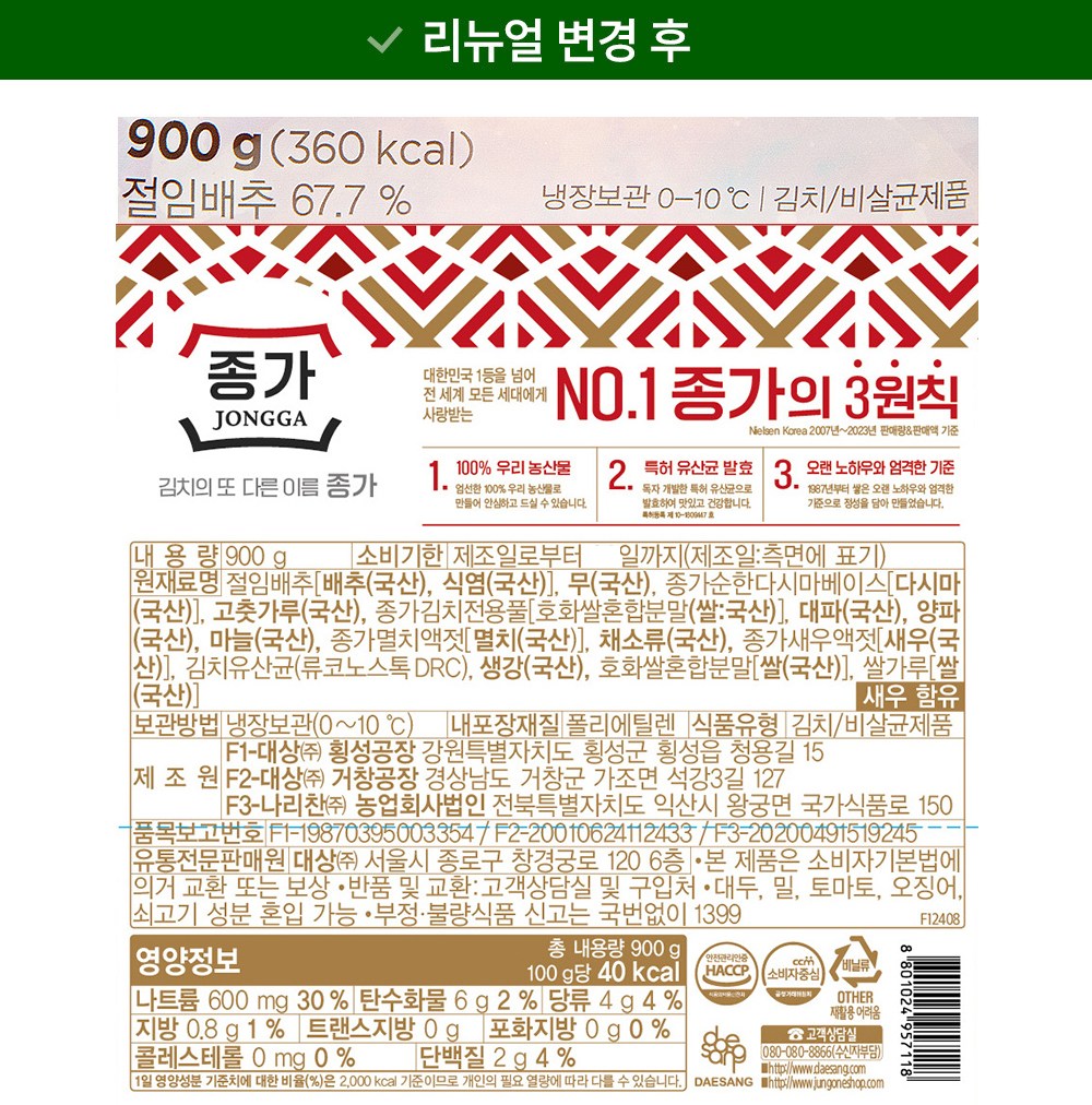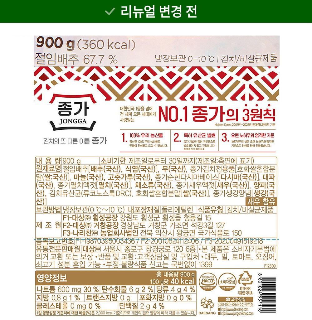 | 제품명 | 포기김치 | 식품의 유형 | 컨텐츠 참조 |
