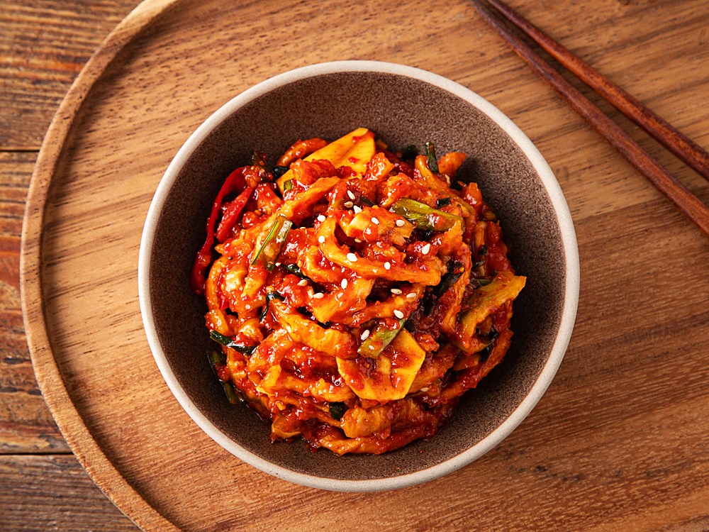 보쌈에 곁들이기 좋은 무말랭이예요. 특유의 칼칼한 감칠맛이 보쌈의 구수한 육향과 조화롭게 어우러지지요. 한입 먹어보면, 꼬들꼬들한 식감이 돋보인답니다. 보쌈뿐 아니라, 기름진 고기 요리에 곁들일 반찬으로 제격이에요.