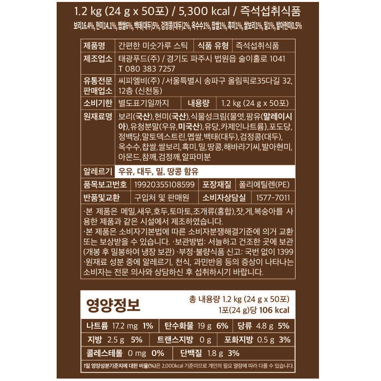 | 포장단위별 내용물의 용량(중량), 수량 | 1200g(24g*50ea) | 원재료명 및 함량 | 컨텐츠 참조 |