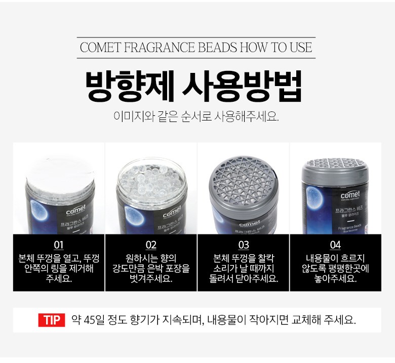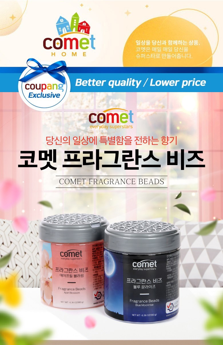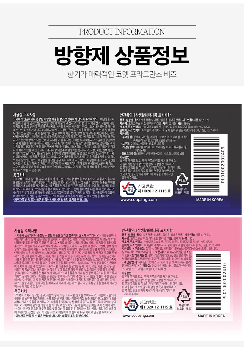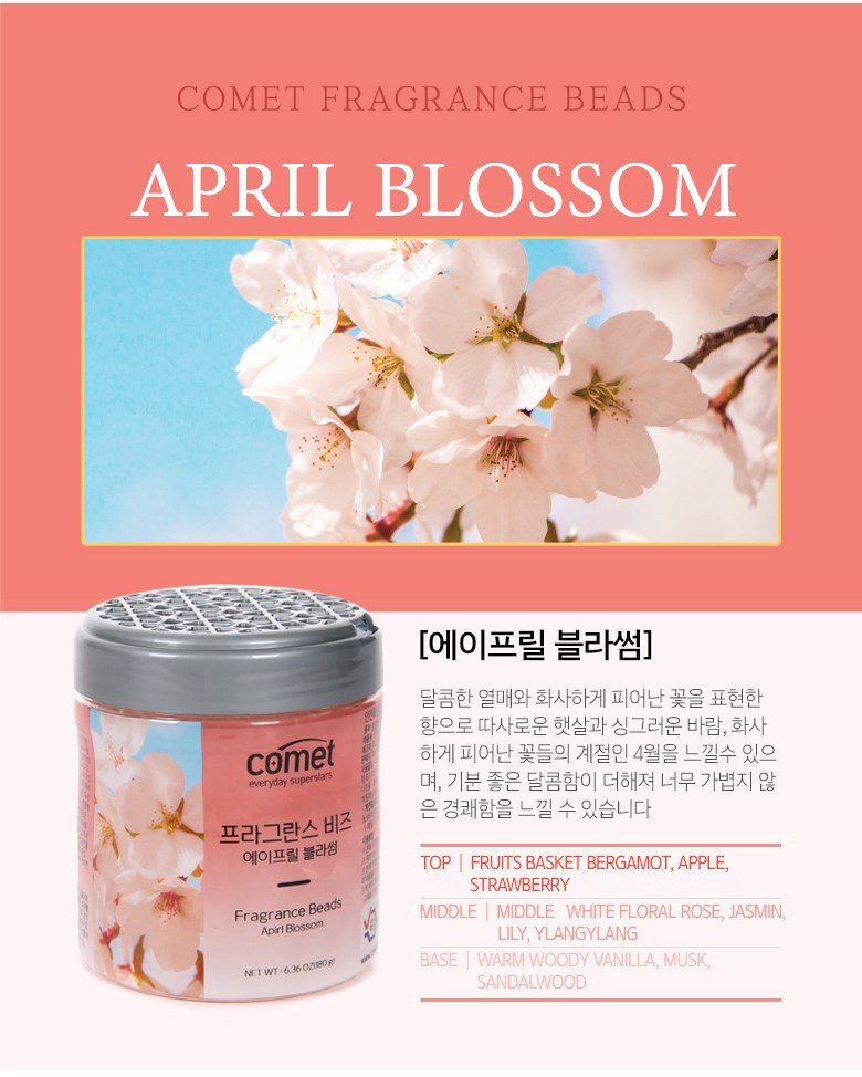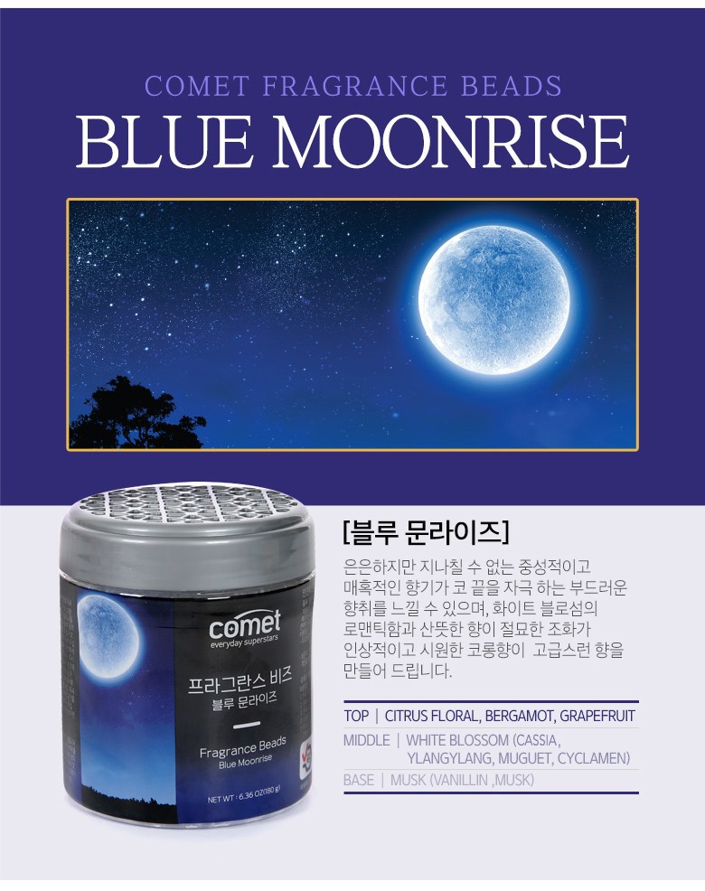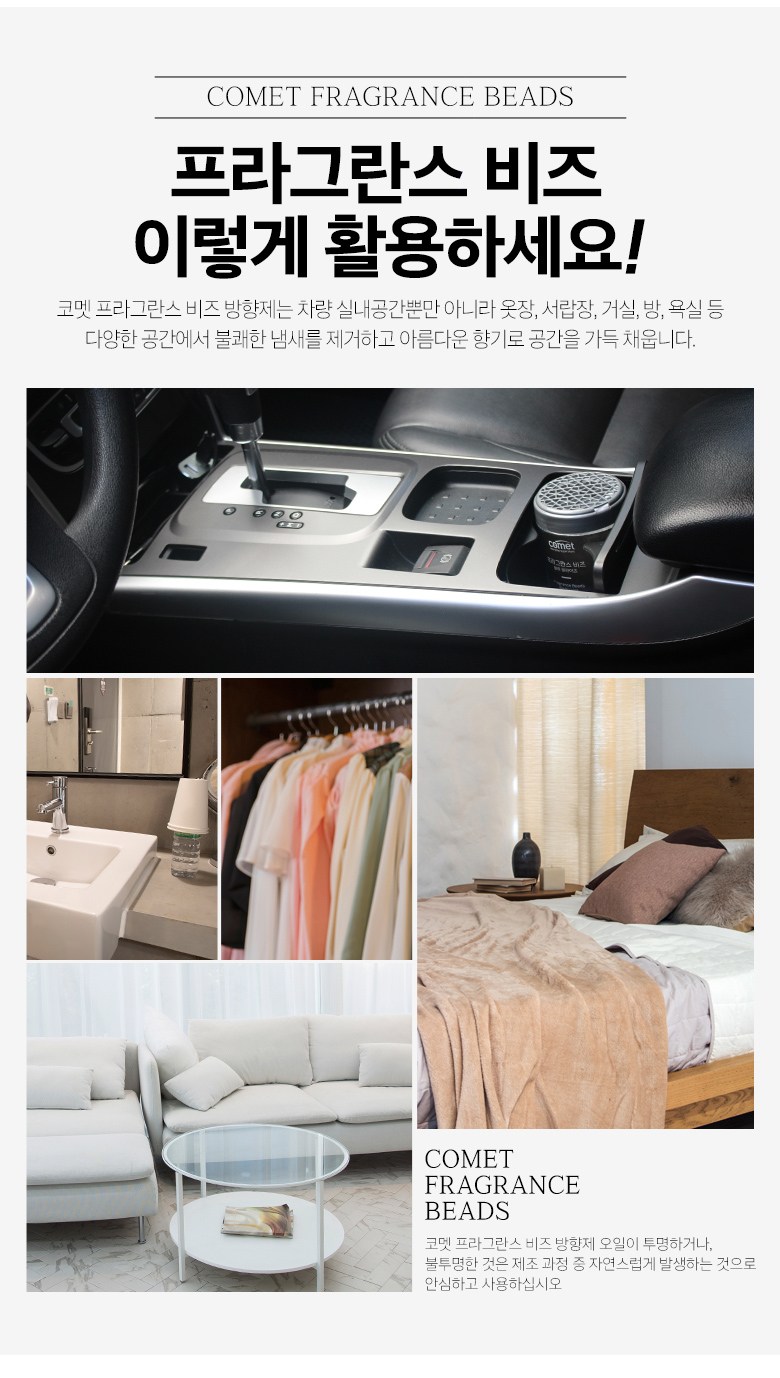 | 품목 및 제품명 | 방향제 / 코멧 프라그란스 비즈 블루문 라이즈향, 코멧 프라그란스 비즈 에이프릴 블라썸향 | 용도(표백제의 경우 계열을 함께표시) 및 제형 | 자동차용(실내용), 일반용(실내공간용) / 고체형 |