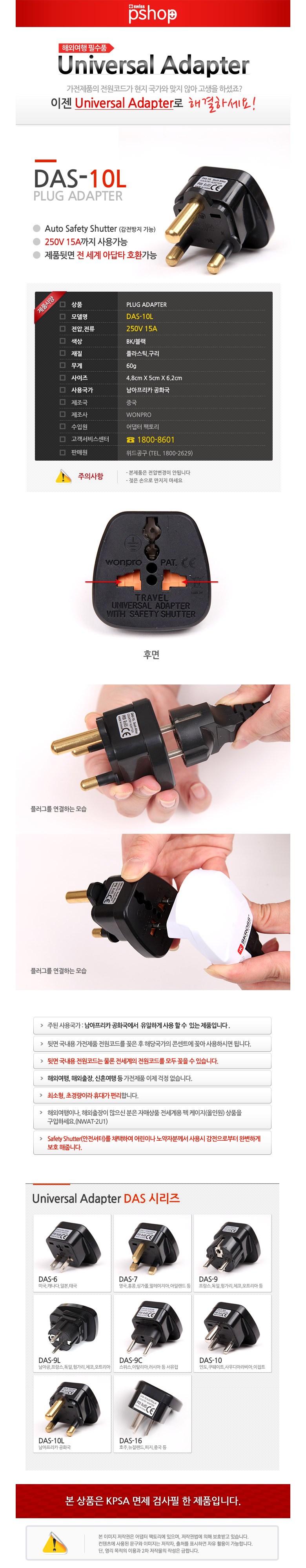 SWISSPSHOP DAS-10L 남아프리카 공화국 호환 어댑터