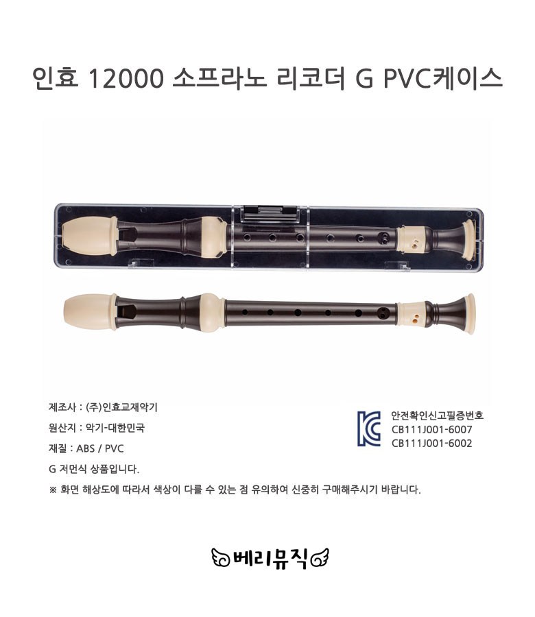 | 품명 및 모델명 | 인효 12000 소프라노 리코더 G PVC케이스 | KC 인증정보 | CB111J001-6007, CB111J001-6002 |
