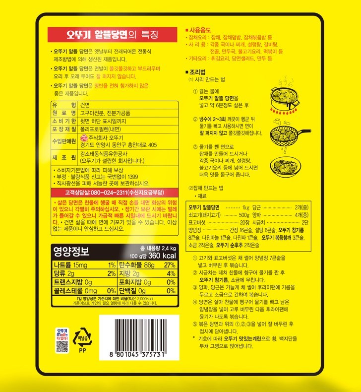 | 제품명 | 오뚜기 알뜰당면 | 식품의 유형 | 당면 |