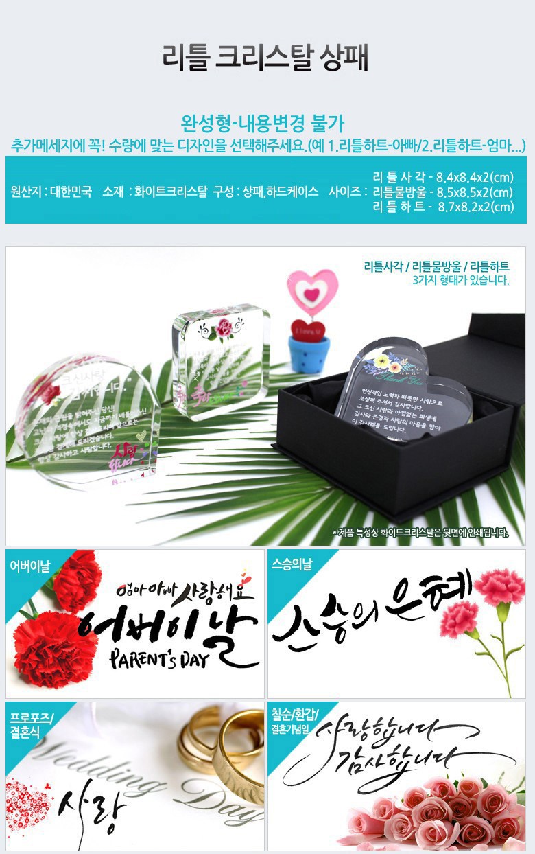 | 제조국(원산지) | 국내 완성품 제작 / 크리스탈,케이스:중국산 | 제조자(수입자) | 아이상패 |