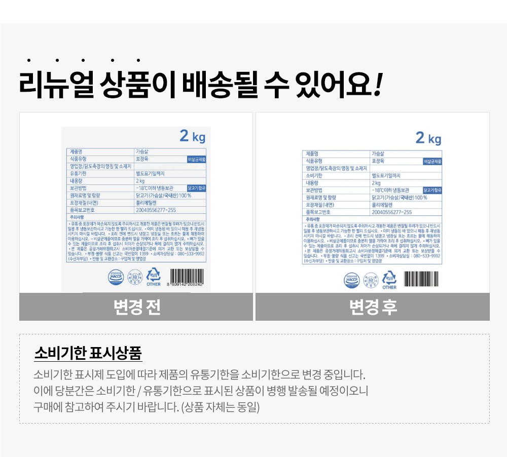 | 제조연월일, 소비기한 또는 품질유지기한 | 소비기한(또는 유통기한) : 2028년 01월 04일 이거나 그 이후인 상품 제조년월일 : 2026년 01월 05일 이후인 제조상품 | 세부 품목군별 표시사항 | 축산물 등급표시 : 해당 없음 / 이력번호 표시유무 : 이력번호 표시제품임 |