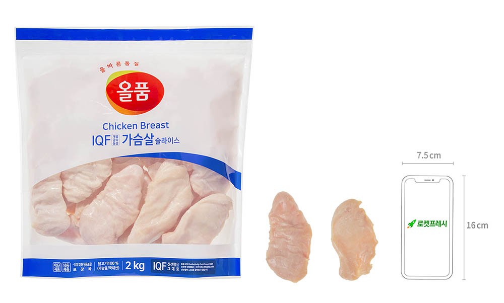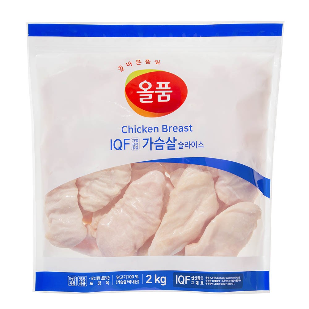 닭가슴살은 샐러드, 볶음밥, 튀김 등 다양한 요리에 활용되는데요. 자주 식탁에 올라오는 만큼 안심하고 먹을 수 있는 올품 냉동 IQF 가슴살 슬라이스를 추천드려요. 개별 동결해 신선함이 살아있지요. 닭가슴살 옆면을 슬라이스했기 때문에 간편하게 요리에 활용할 수 있어요.