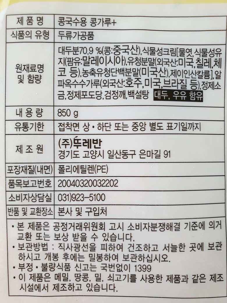 | 제품명 | 콩국수용 콩가루+ | 식품의 유형 | 두류가공품 |