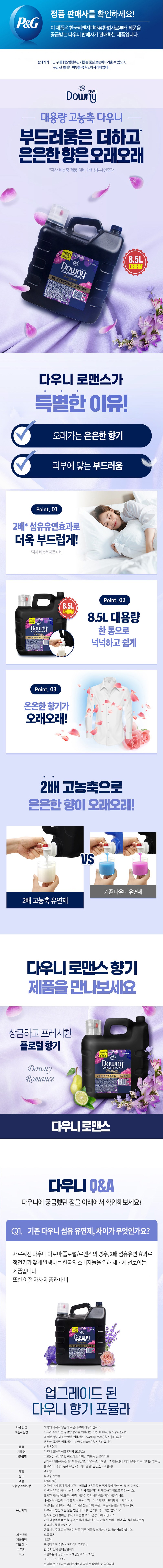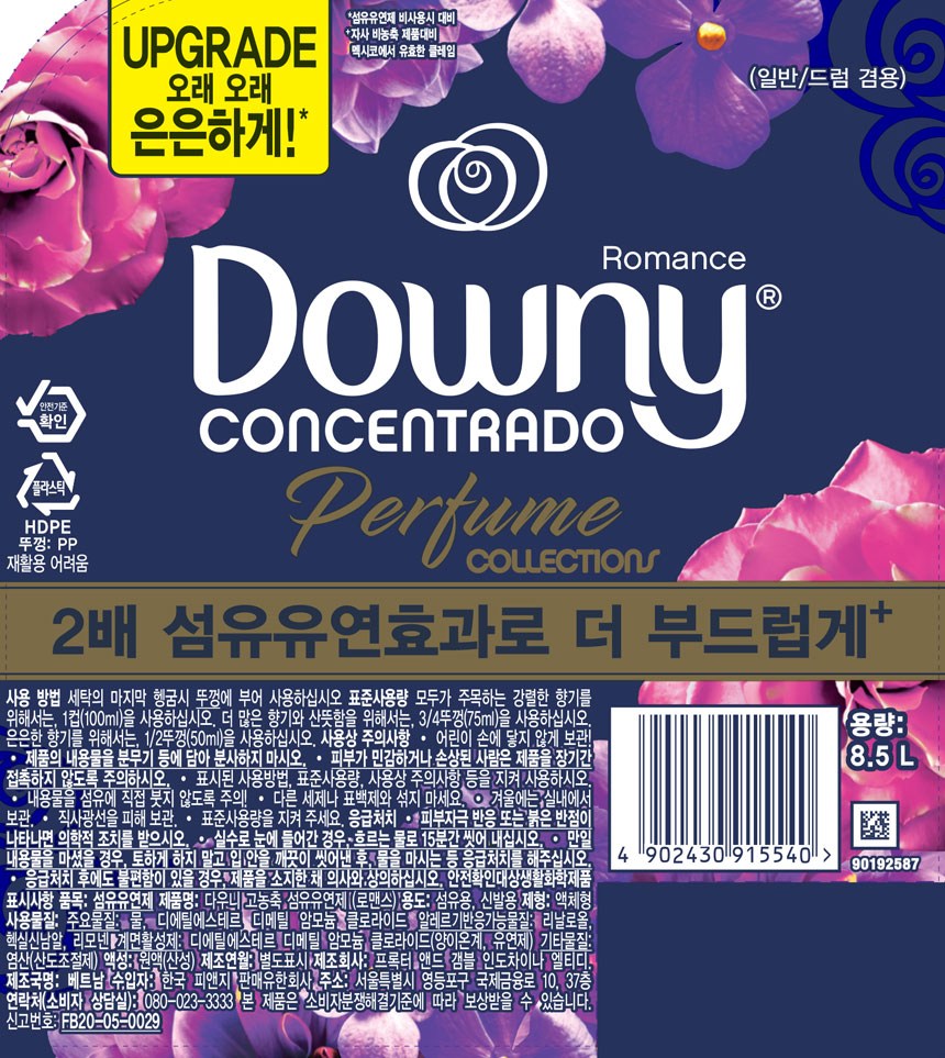 | 품목 및 제품명 | 섬유유연제 / 다우니 고농축 섬유유연제 (로맨스) | 용도(표백제의 경우 계열을 함께표시) 및 제형 | 신발용, 섬유용 / 액체형 |