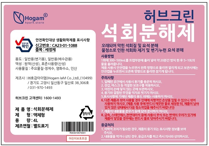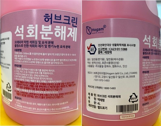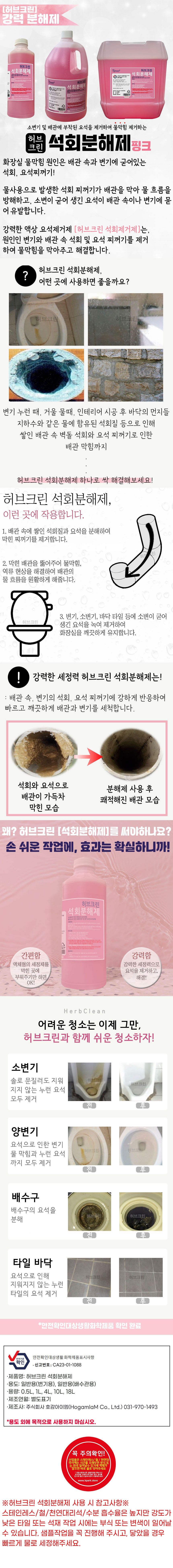 | 품목 및 제품명 | 세정제 / 허브크린 석회분해제_요석 소변기 하수구 배수구 막힘 해결 | 용도(표백제의 경우 계열을 함께표시) 및 제형 | 일반용(변기용), 일반용(배수관용) / 액체형 |
