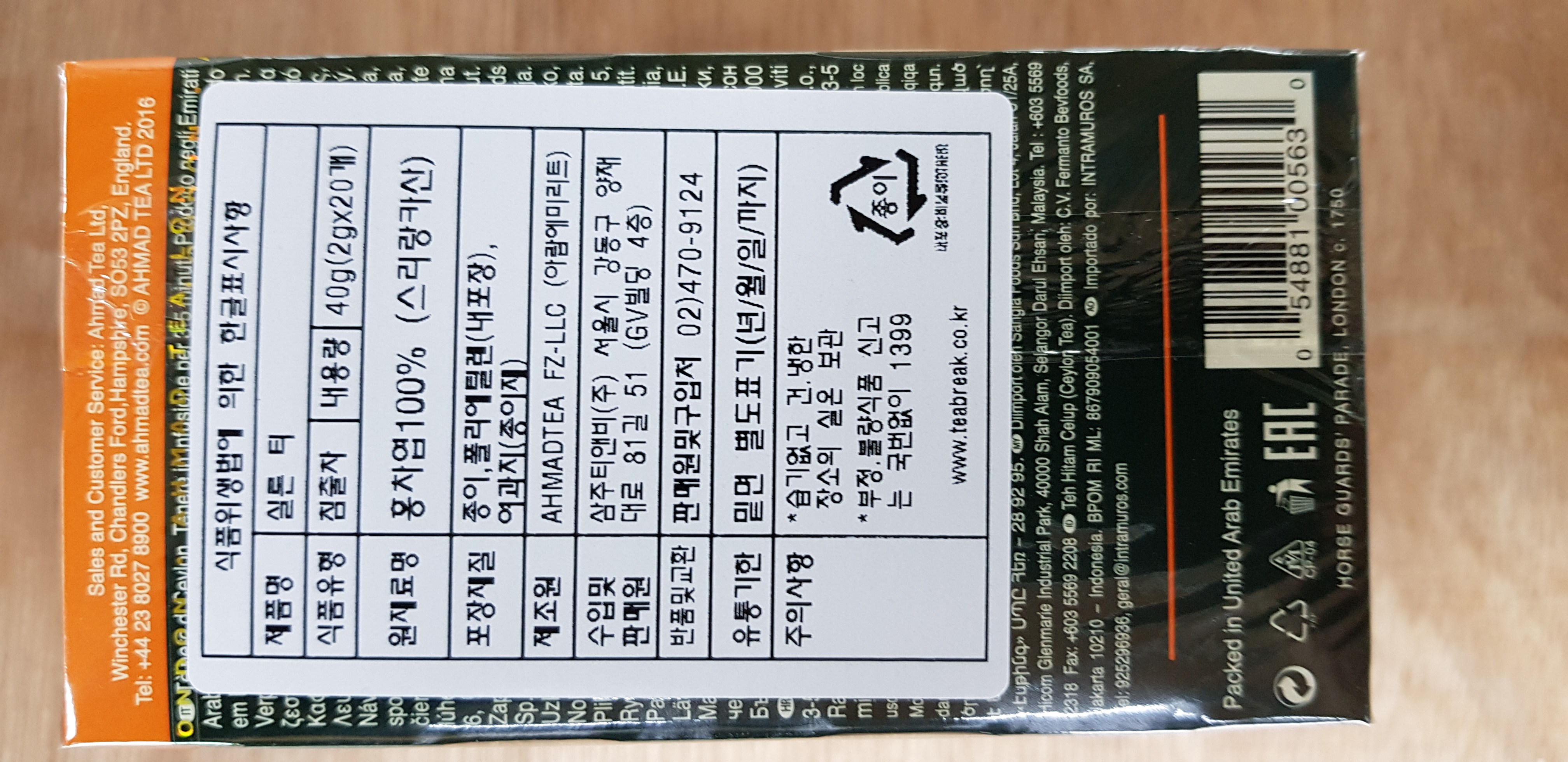 | 생산자 및 소재지 | AHMAD TEA FZ-LLC / 삼주티앤비(주) / 아랍에미리트 | 제조연월일, 소비기한 또는 품질유지기한 | 소비기한(또는 유통기한) : 2027년 10월 22일 이거나 그 이후인 상품 제조년월일 : 2024년 10월 23일 이후인 제조상품 |