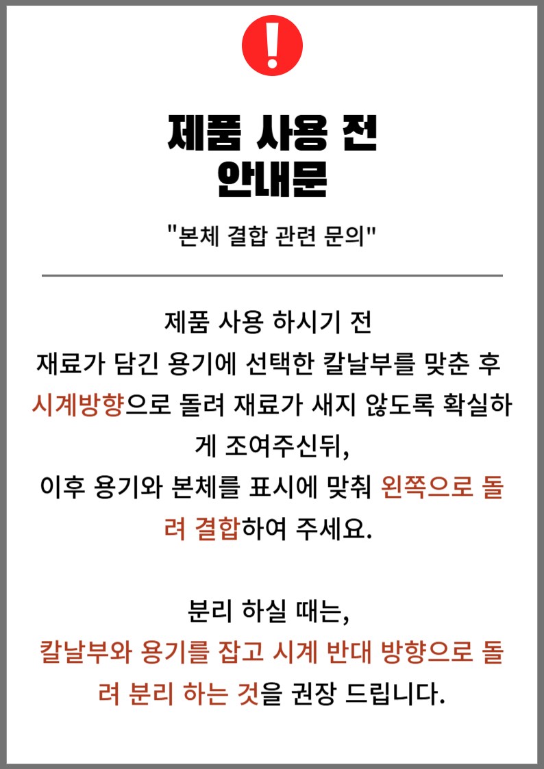 - 구성품: 본체 + 6중 칼날 + 텀블러 600ml + 텀블러 뚜껑 + 손잡이 컵 500ml + 스트로우 전용 뚜껑 + 전용 스트로우