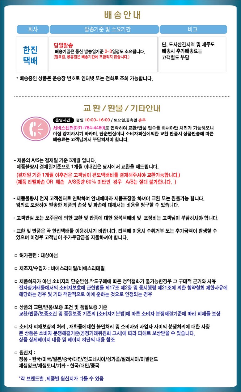 - ㆍ교환/반품에 관한 일반적인 사항은 판매자가 제시사항보다 관계법령이 우선합니다.