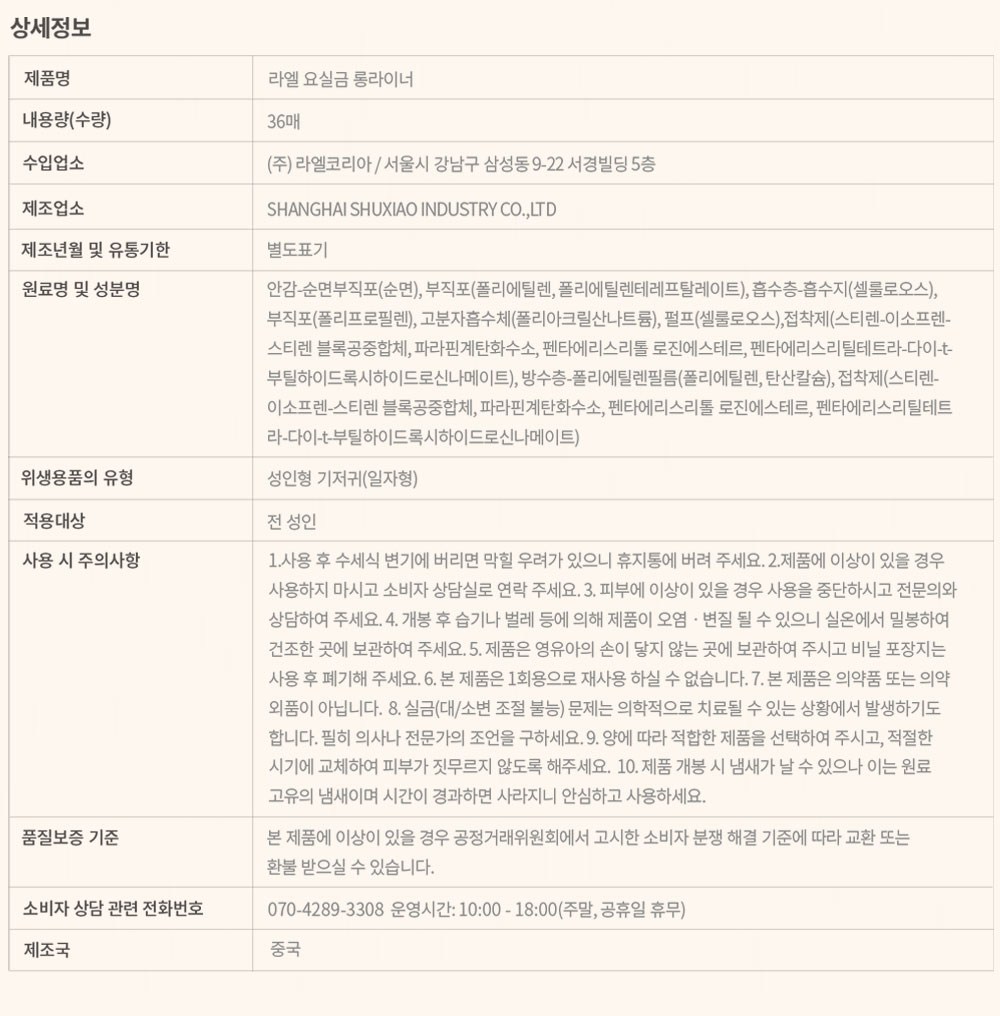 | 품명 및 모델명 | 라엘 요실금 롱 라이너 | 인증/허가 사항 | 해당없음 |