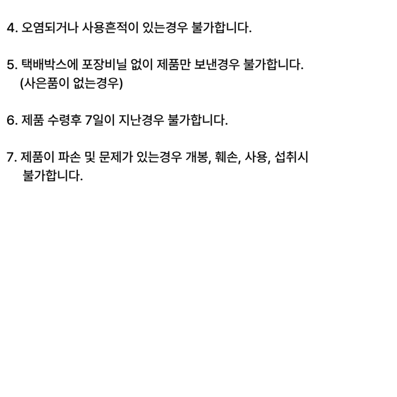 - ㆍ모니터 해상도의 차이로 인해 색상이나 이미지가 실제와 달라, 고객이 단순 변심으로 교환/반품을 무료로 요청하는 경우