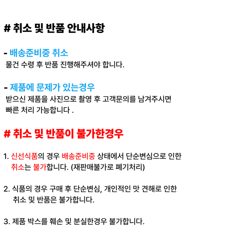 - ㆍ교환/반품에 관한 일반적인 사항은 판매자가 제시사항보다 관계법령이 우선합니다.