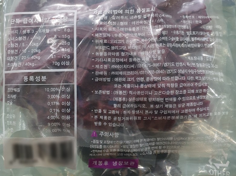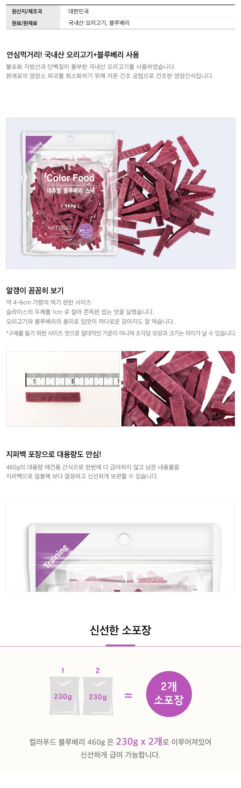 | 품명 및 모델명 | 컬러푸드 네츄럴 블루베리 스낵 460g | 인증/허가 사항 | 사료관리법에 따른 성분등록번호 : 컨텐츠 참조 |