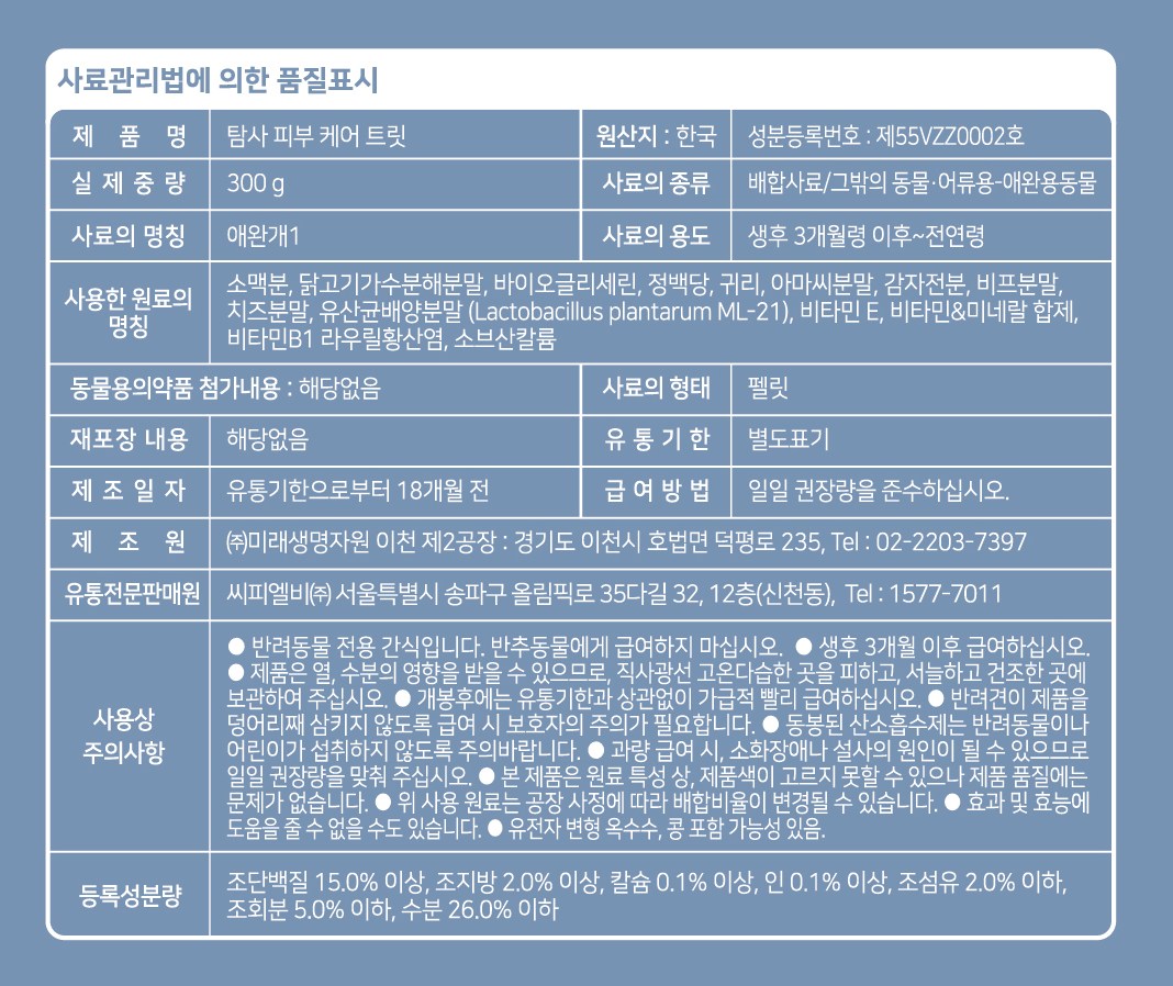 | 품명 및 모델명 | 탐사 피부 케어 트릿 300g | 인증사항 | 해당사항없음 |