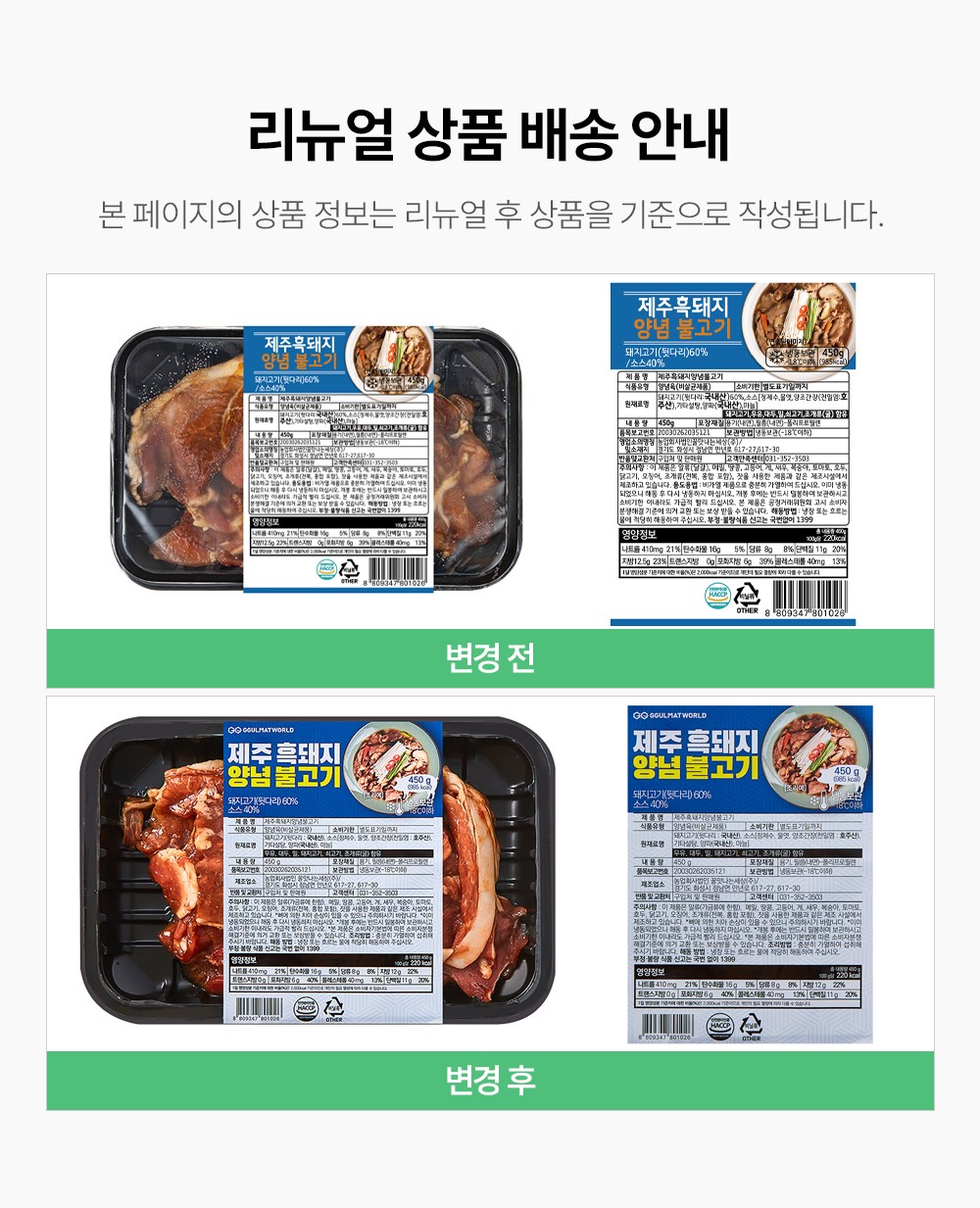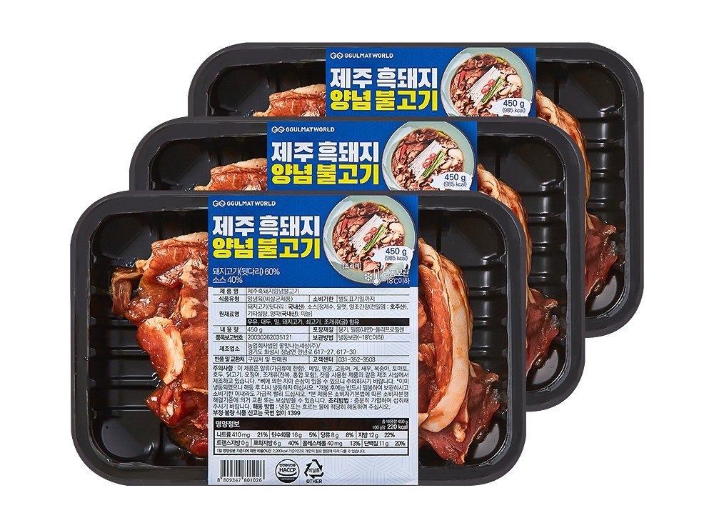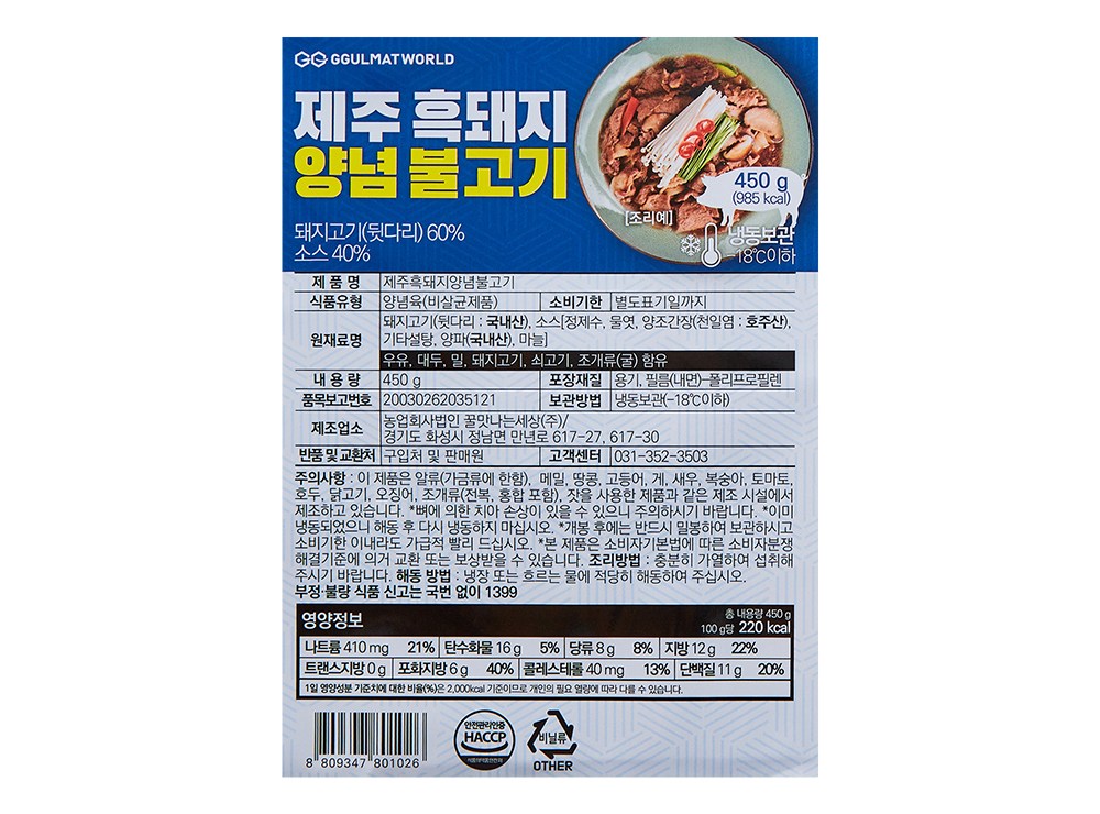 | 제품명 | 제주 흑돼지 양념 불고기 | 식품의 유형 | 양념육(비살균제품/가열하여 섭취하는 냉동식품) |