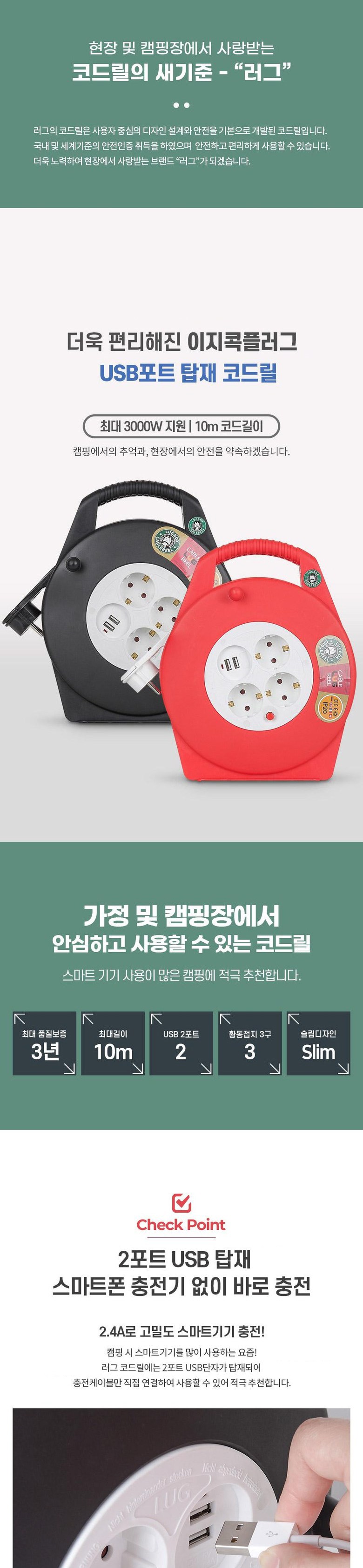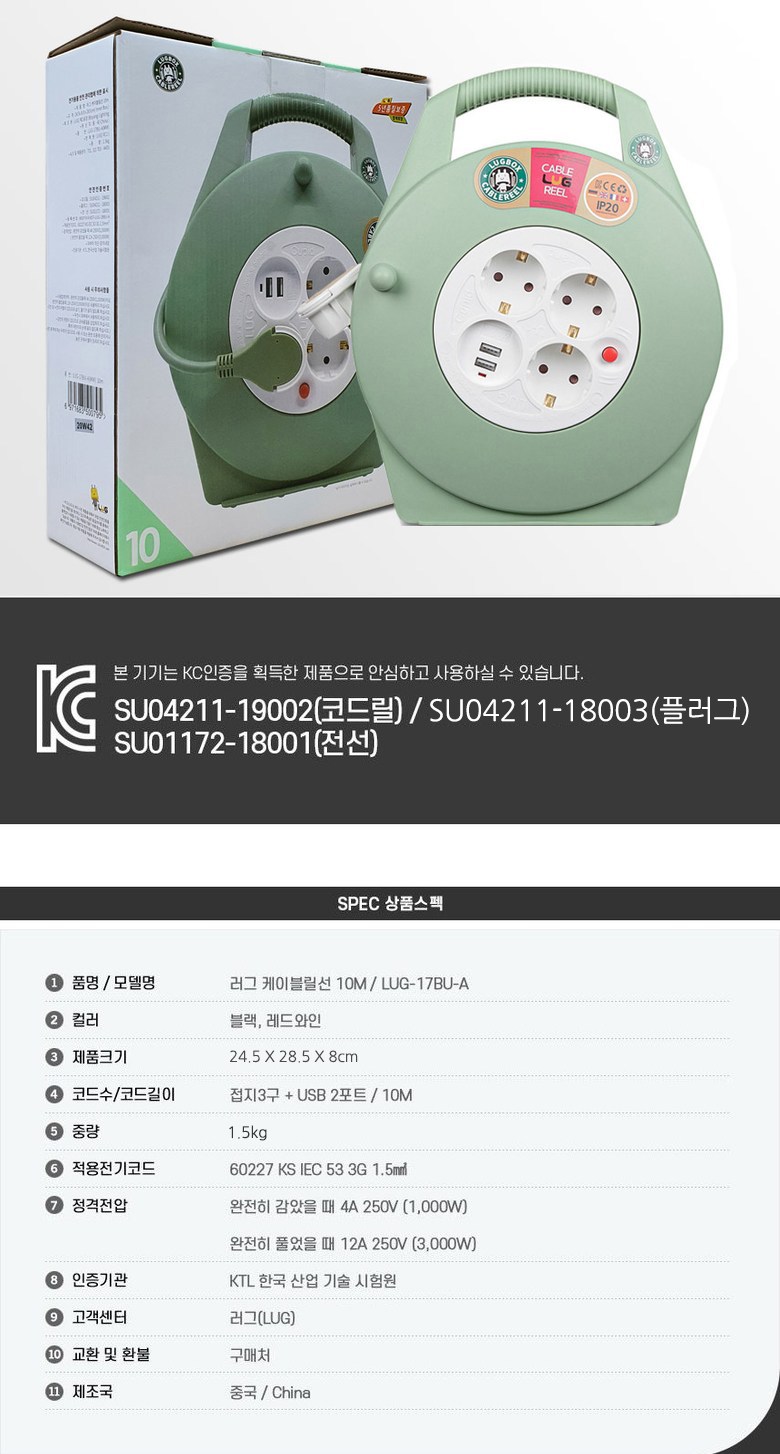 | 품명 및 모델명 | 러그 케이블릴선 10M(접지3구+USB 2포트)초슬림 민트 / LUG-17BU-A(MW) | KC 인증정보 | 본품 : R-R-N57-LUG-19BU-A / 코드릴 : SU04211-19002 / 플러그 : SU04211-18003 / 전선 : SU01172-18001 |
