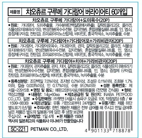 | 품명 및 모델명 | 챠오츄르 구루메 가다랑어 버라이어티 60개입 | 인증/허가 사항 | 사료관리법에 따른 성분등록번호 : 컨텐츠 참조 |