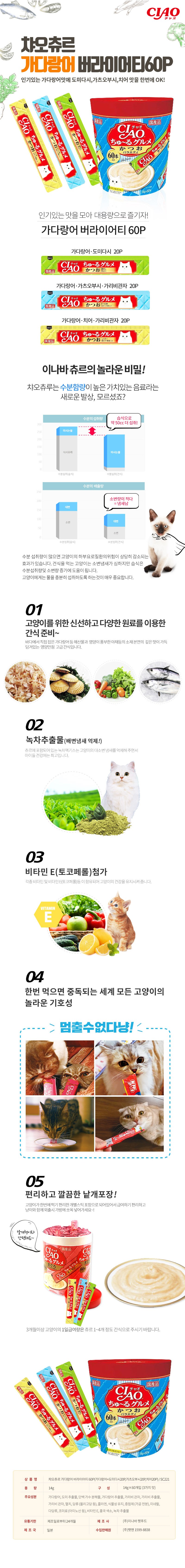 - 식품 기능: 반려동물간식 츄르 가다랑어 버라이어티 60개입
