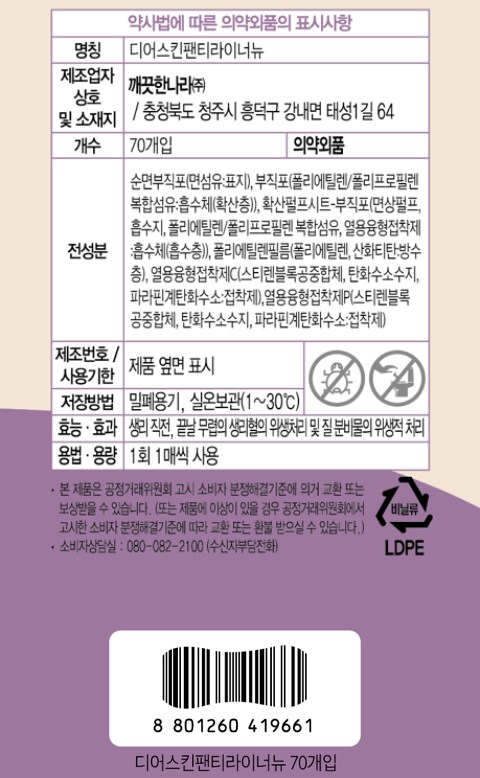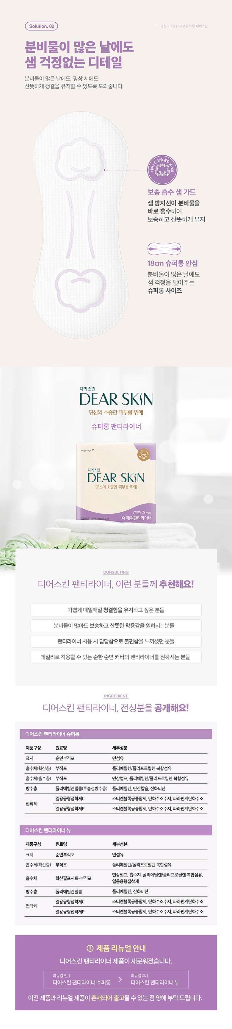 | 품명 및 모델명 | 디어스킨팬티라이너뉴 | 인증/허가 사항 | 의약외품 |