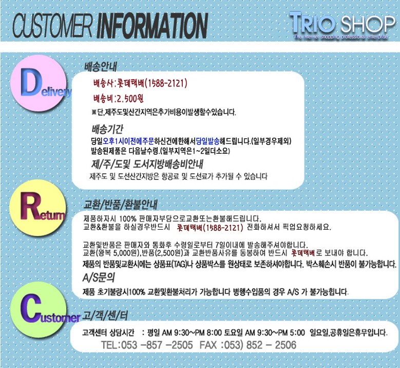 - ㆍ교환/반품에 관한 일반적인 사항은 판매자가 제시사항보다 관계법령이 우선합니다.