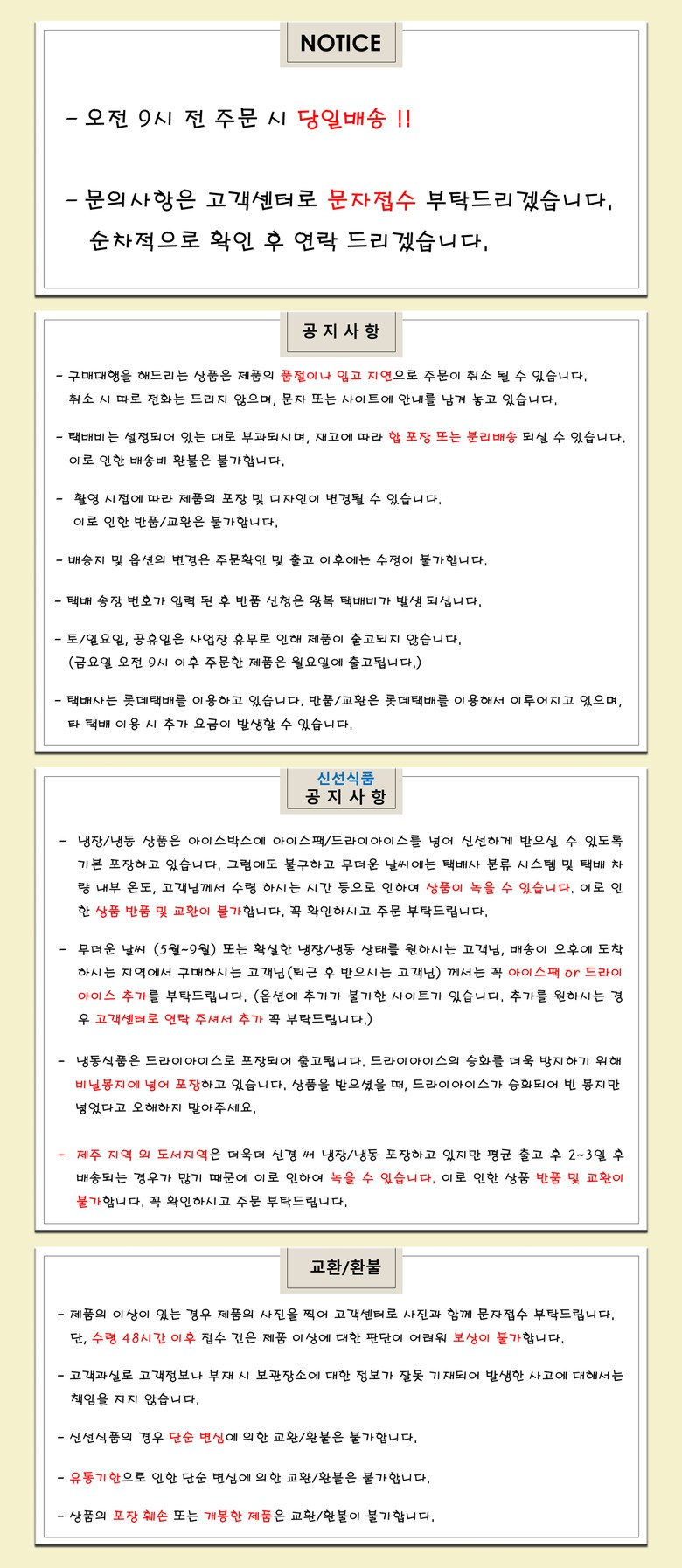 - ㆍ모니터 해상도의 차이로 인해 색상이나 이미지가 실제와 달라, 고객이 단순 변심으로 교환/반품을 무료로 요청하는 경우