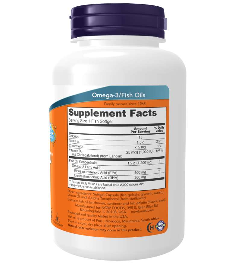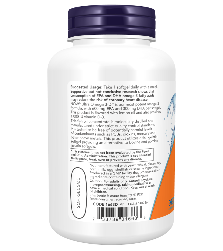 울트라 오메가 3-D 식이 보조제입니다. 1인분 당 15칼로리, 지방, 콜레스테롤, 비타민 D3, 어유 농축물, EPA, DHA 등을 제공합니다.