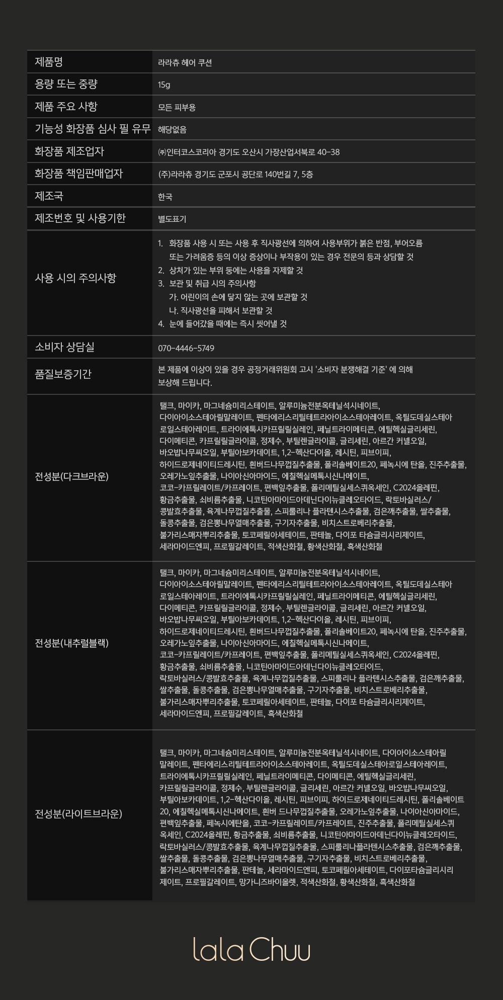 | 화장품제조업자, 화장품책임판매업자 및 맞춤형화장품판매업자 | (주)인터코스코리아/(주)라라츄 | 제조국 | 한국 |